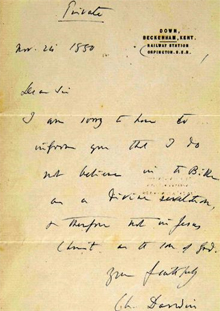 나는 성경을 신의 계시라 믿지 않으며, 그에 따라 예수 그리스도를 하나님의 아들이라 믿지 않습니다. 이렇게 말씀드릴 수 밖에 없어 죄송하게 생각합니다. –찰스 다윈 –
